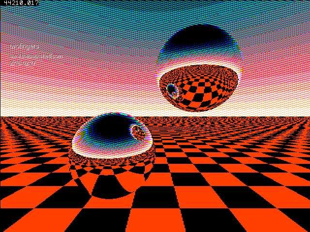 And also on the RP2040-GEEK. ' - RP2040-GEEK - 'MODE 2 Dim cmap(15) cMap(1)=RGB(Red) cMap(2)=RGB(Yellow) cMap(3)=RGB(White) 'Map set For N=0 To 134 '239->134 'ILI9341=320x240 ST7789_135=240x135 For M=0 To 239 '319->239 X=0:Y=-.1:Z=3 U=(M-119.5)/120:V=(N-67)/120 '159.5->119.5 117.5->67 160->120 W=1/Sqr(U*U+V*V+1):U=U*W:V=V*W I=Sgn(U):G=1 Do E=X-I:F=Y-I:P=U*E+V*F-W*Z D=P*P-E*E-F*F-Z*Z+1 If D>0 Then T=-P-Sqr(D) If T>0 Then X=X+T*U:Y=Y+T*V:Z=Z-T*W:E=X-I:F=Y-I:G=Z P=2*(U*E+V*F-W*G):U=U-P*E:V=V-P*F:W=W+P*G:I=-I Loop EndIf EndIf If V<0 Then P=(Y+2)/V:V=-V*((Int(X-U*P)+Int(Z-W*P)And 1)/2+.3)+.2 EndIf Color cMap(3-(48*Sqr(V)+(7*(M+4*N))Mod 16)\16) Pixel M,135-N '240->135 Next Next Jan. |