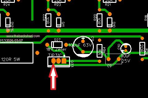 Can you measure at the pin of the TIP31 pointed to by the arrow? |