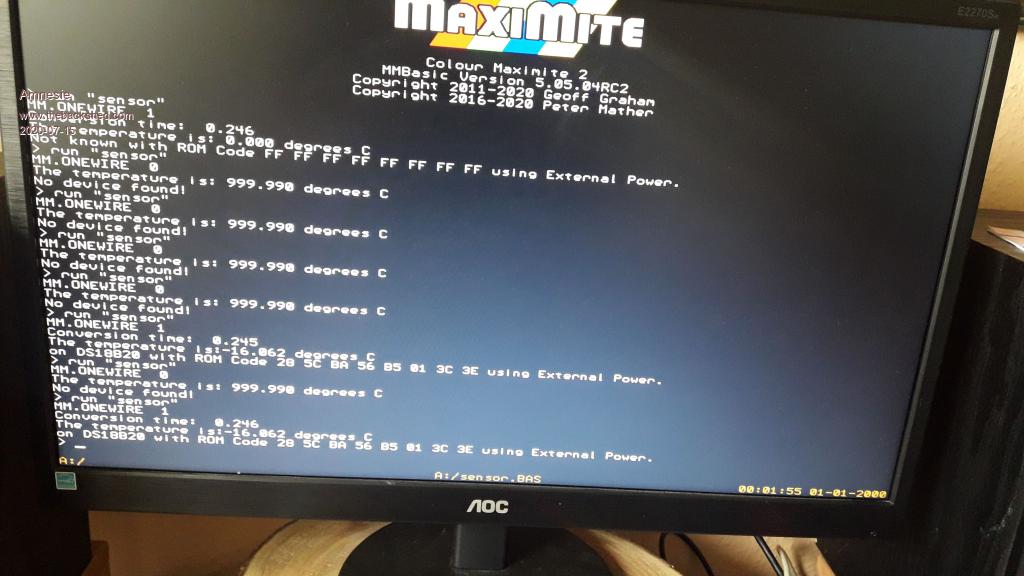 I just tested whether my ds18b20 is a fake or not with the suggested test methods via my atmega328p RESULT as expected: But what I still not understand: why does the sensor work with my atmega328p? There must be something different in the maximite firmware than in the library I used. The obvious fact, that on my atmega328, the sensors run @ 5Volts can not be the problem, because I tried it with the maximite, too. But as I said: I ordered a original ds18b20 here in germany at a licenced distributor. And will reply the results! Nevertheless it would be cool, if the maximite would even run with counterfeits, since (according to this link Andre & bigfix posted) nerly every sensor @ ebay is a fake one! Edited 2020-07-16 00:00 by Amnesie |