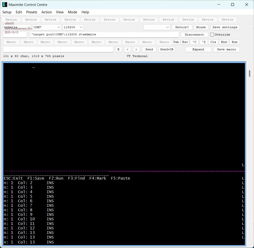 with RP2350 webmite I get the following screen when using "EDIT" .... ![]() for each character I type in, I get an additional line at the bottom. > option list WebMite MMBasic RP2350A Edition V6.01.00b20D OPTION FLASH SIZE 4194304 OPTION COLOURCODE ON OPTION CPUSPEED (KHz) 150000 OPTION DISPLAY 45, 145 OPTION WIFI JN88fg, *********, RP2350-1 Client software is MMCC, latest edition. I did nuke the flash before uploading the debugging firmware ... Is there anything I did not set correctly? I also have crashes (pico reboots) with RP230 (non-webmite) on calling a function but I have to investigate that further and boil it down to something that can be reproduced with short code. 73 de OE1HGA, Gerald |