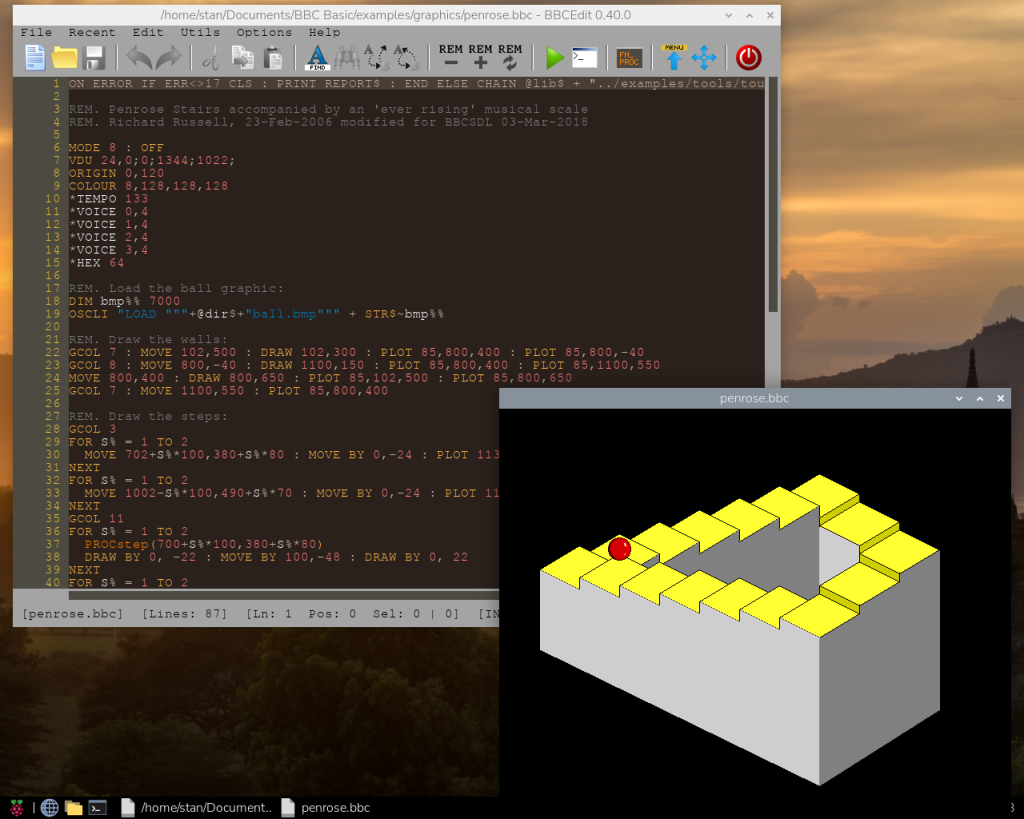 I'm liking bbc basic for trixie rpi 400. new to me and does what a bbc micro wouldn't have done at the same speed. the demos are impressive. but what is it? the ball moves up the "stairs" |