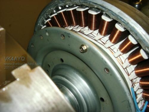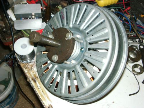 Side view of the rotor and puller and the terminal strip I fitted to terminate the winding ends of the stater.