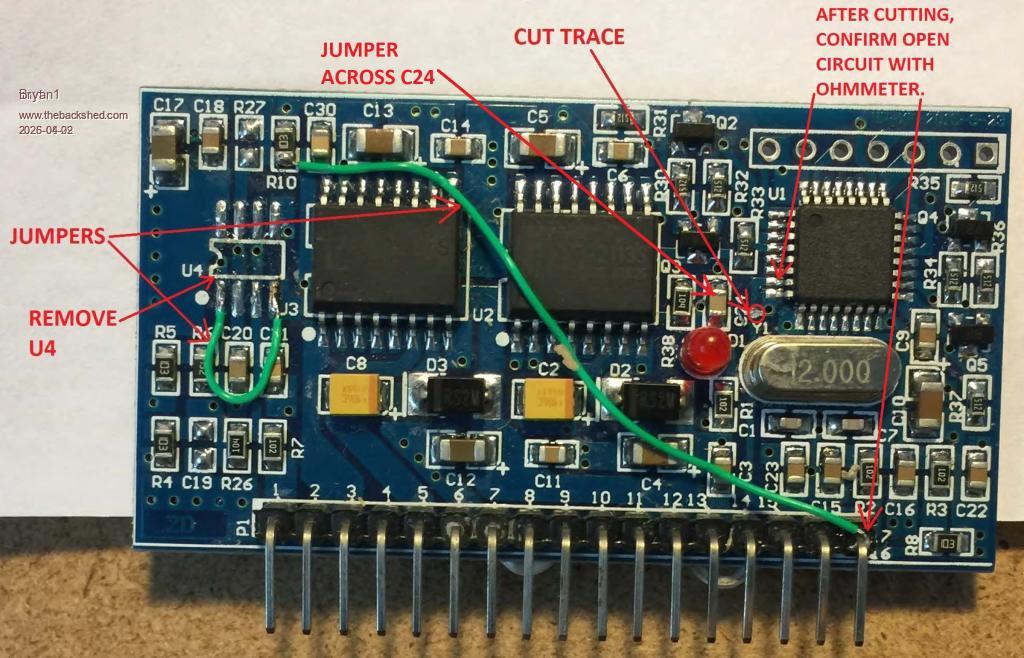 Yea Pete that inverter build was a Madboard one that I spent ages to build and it is sad it's now on the scrap pile. Now I pinched this pic from TinyT's thread ![]() So with his mod yes the U4 chip is removed and pins 1 and 4 had the jumper wire, now the 7-8 pins weren't shorted. Anyway got a couple of weeks before the board arrives so plenty of time to get my head around whats needs to be done. Regards Bryan |