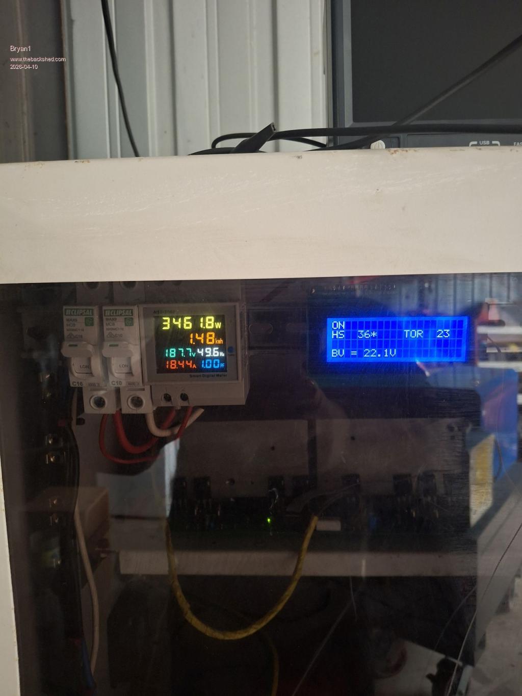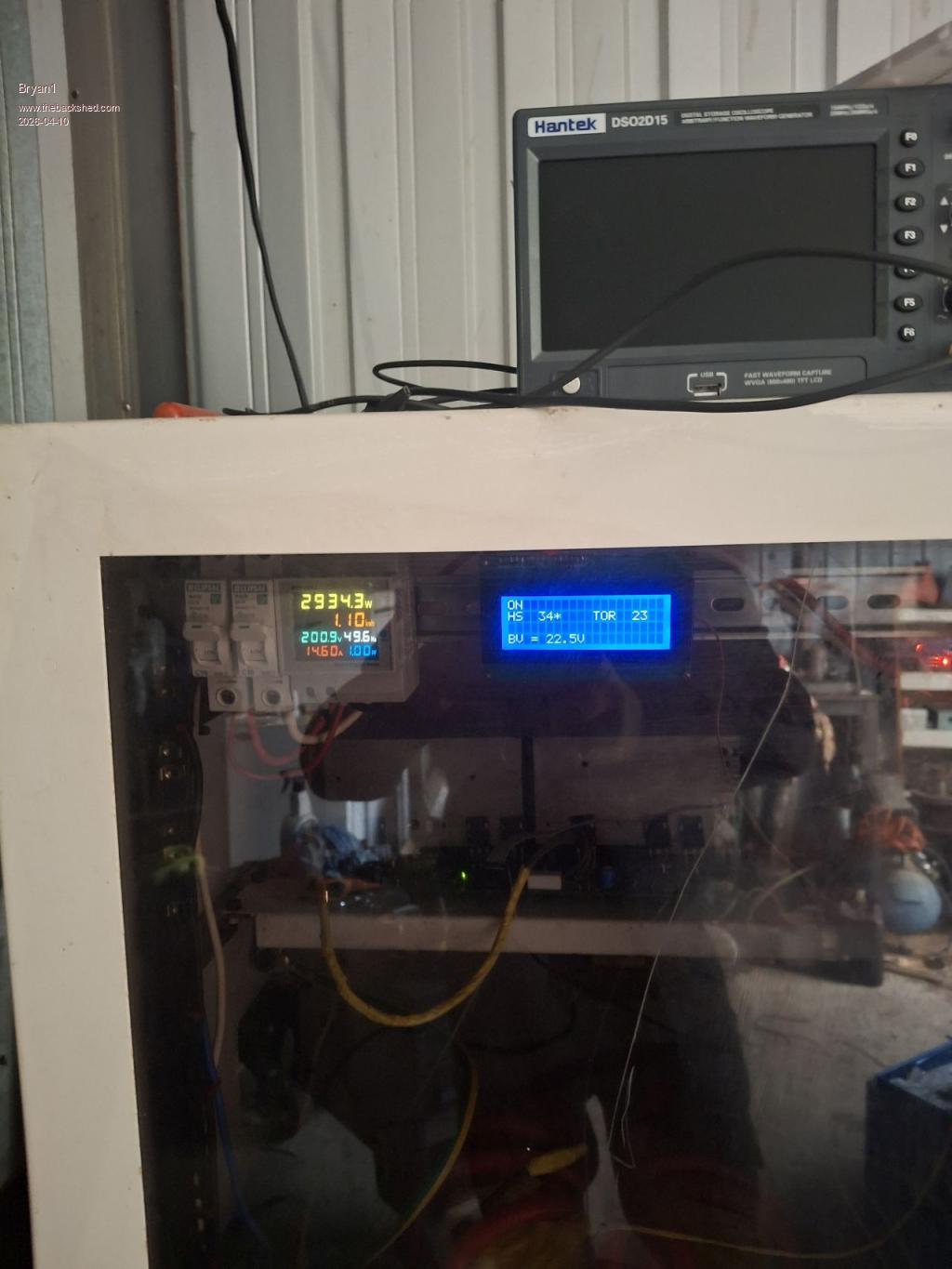 Keepis I left this inverter running overnight where that multi function unit said 4-5 watt and it was still the same this morning. Over night when the fridge run didn't make a huge difference in the over night low of the batteries. In fact it was good 1/2 a volt higher using the app for the Victron MPPT than the last few days and yes I do use SG as a reading of battery charge. Now I just took some temp readings with my infrared temp gauge where the mosfets on L01 are about 2C lower than L02, now looking at the 32C I saw on the mosfets on the outer mosfets the inner mosfet that used for the test is the same as the L01 mosfets. I am thinking of making the lower temp cut off for HS to 33C as from several temp tests do confirm that 32-33C reading. 4.4Kw so far is a good sign I think too and seeing 18.5 amps on the AC side does make me want to see 20 amps ![]() Also while doing these test I see the AC voltage drop under the load now the 49.6Hz shown on the multi function used didn't budge under load so I do think that is a good sign this inverter is working correctly. Edited 2026-04-10 14:00 by Bryan1 |