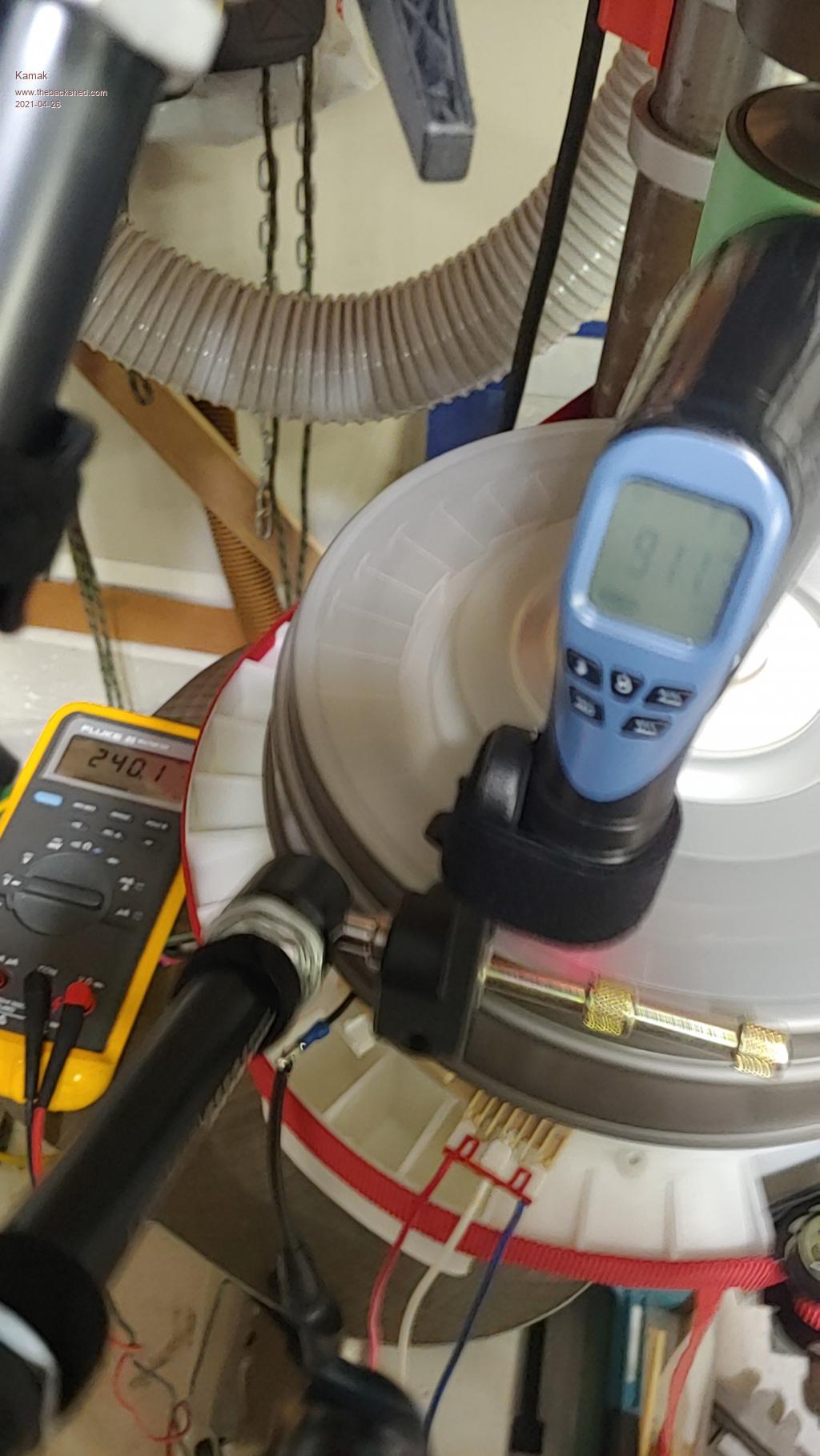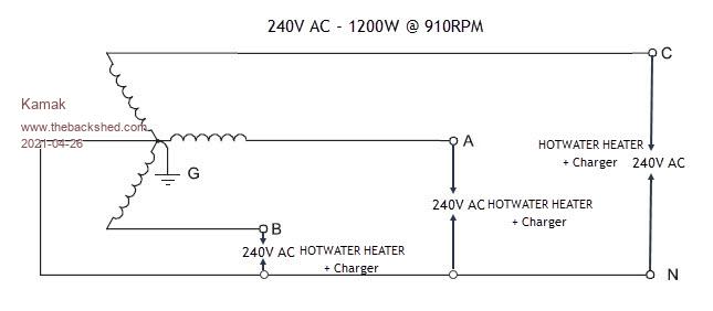 Well yeah, I do intend to make it survive most common weather conditions, but as for useful excessive power, still within safe rpm range, but that is above the voltage range that it is designed for, dump loading into something useful like hot water heating would be a good method I suppose. At the moment, I'm only getting 7.7V max. at 2.7A max. ac (20.79W) maximum through a 2.7 ohm 750W resistor across one winding and neutral at 1000RPM. There must be such a minimal ability for the generator, with its combination of existing stock magnets with low magnetic flux density and the number of wire wraps per stock star leg, that it can not produce many amps through such a low resistive load. The three winding each have 6.2 ohms of internal resistance. The light bulb I used, the other day, was 10ohms - cold. it was only a 100W capable device and I was able to put approx 120V at approx 0.919A through it at 500RPM. 120x0.919 = 110.28W. 120/0.919 = 130ohms - hot. I need a higher resistive load capable of higher wattage with a minimum of 2.7A capability, but I can't exceed the RPM of 1000. Open circuit voltage across any winding and neutral is 240V @910RPM @500RPM, the voltage across one winding and neutral was 120V and 0.9A with a 130ohm dynamic resistor, a bulb, temp dependant. 32ohms = 240W/2.7A^2 88ohms = 240V/2.7A, P = 240x2.7 = 648W, Maybe that's the one, 88ohm resistor capable of 750W I found an off the shelf resistor 82ohms, 750W max, V = 82 x 2.7 = 221.4V, 221.4V^2/82ohms = 597.78W, If at 240V^2/82 = 702.439W but that suggests an amperage greater than 2.7A, which I don't think it will produce. That would be 240V/82ohms = 2.927A. 240.5V/916RPM = 0.26255V/1rpm open circuit. Check: 0.26255 x 500rpm = 131V open circuit. 366.5Hz = 366.5/24poles x 60sec = 916.25RPM ![]() Edited 2021-04-27 16:12 by Kamak |