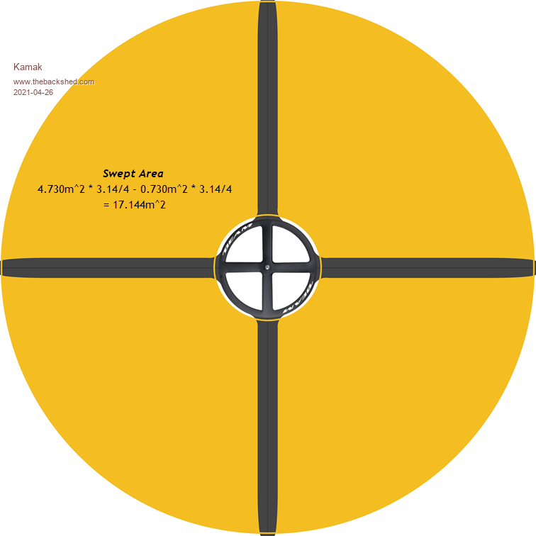 4730mm Dia 4 blade prop. High torque @ low rpm. This is just a guestimate at this point, but I think I'm in the ballpark. ![]() Edited 2021-04-26 04:11 by Kamak |