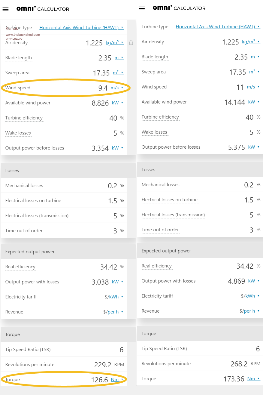 Sorry I was playing around with that for a while. That was giving me some head-scratching. There is a massive drop in power produced at 6kph wind as opposed to 20kph winds. So much so, I'm still hesitant that I calculated it correctly. But I think it is correct. It's those cubings, get you every time. P = 126 N.m/s, 1200W @ 910 rpm, 240V @ 5A p = 1.22527 A = 17.144m^2 Cp = 0.35 V = X m/s Ng = 1 Nb = 0.95 126= 0.5 x 1.22527 x 17.144 x 0.35 x X^3 x 1 x 0.95 V = (126/0.5 x 1.22527 x 17.144 x 0.35 x 1 x 0.95) v3(cube root 3) v = 3.402m/s = 12.25kph 12.25kph required to produce 1200W by the generator (240V @ 5A) through a 10:1 planetary gearbox. Edited 2021-04-26 15:11 by Kamak |