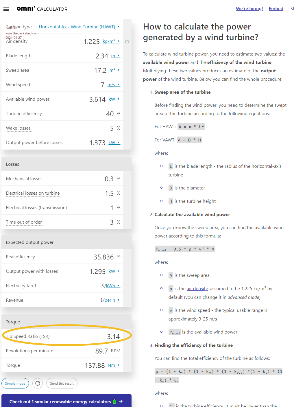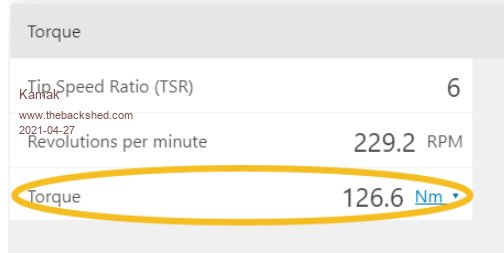 Well, this is actually starting to look more sensible and realistic. I had to recalculate for a 4 blade rotor. 4 x pi/4 = 3.14 TSR More torque at less speed. |
