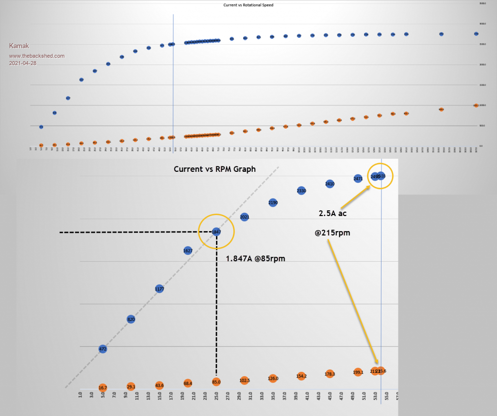 You have to see the other post I've made, with regards to my suspected reasons for the 2.7ohm resistor, the 100W light bulb, and the graph above. The resistor is too low, compared to the resistance of the internal windings, I believe. It's just like shorting the two ends of the windings (neutral and #1, say) through the meter, nearly no voltage. It's capable of producing lots of voltage, with a max of 2.7A. The light bulb proves that it can produce at least 120W. I demonstrated it. I just need 88ohms at 700W. So I'm getting 11x 8ohm resistors capable of 100W each (88ohms @1100W). 2.7A^2 x 88ohms = 641.5W through one winding @ approx. 240V. But the graph says that gains after 2.5A are negligible. and that occurs way down in the rpm range. approx 200rpm. This makes it more practical to use a 2:1 ratio planetary, at 100rpm input. So maybe at around 2.5A, 2.5A^2 x 88ohm = 550W per winding = 1650W @ 220V (x 3 windings), 2.5A x 88ohms = 220V. Proven with test hopefully. approx. 0.26255V/1rpm (open circuit). 220/0.26255 = 837.9rpm Maybe back up to an 8:1 planetary I'm not sure at what rpm it will reach 2.5A with an 88ohm load Three step down transformers, one for each winding. Edited 2021-04-28 13:40 by Kamak |