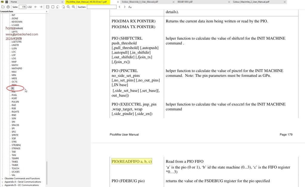 Command PIO, Page 139 ff Appendix F, Page 196 ff Am I overlooking something? What exactly do you mean? I find the description very brief in some places. Unfortunately, the search for PIO also finds GPIO. I have buttons on my eyes. The optional parameter completioninterrupt is the name of a MMBasic subroutine rthat will be called when the DMA completes and in the case of DMA_OUT the FIFO has been emptied. If the optional interrupt is not used then the status of the DMA can be checked using the functions: MM.INFO(PIO RX DMA) MM.INFO(PIO TX DMA) For testing purposes, I inserted a ‘Print MM.INFO(PIO TX DMA)’, whereby even here a 1 is sometimes reported when the FLAG is already 0 again via PEEK (see above)? Is that possible? Oh dear, Peter, how do you keep track of all this complexity? |