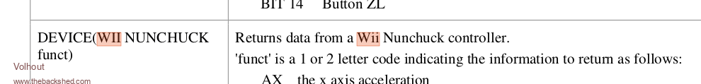 @Geoff, For the user manual of 6.01.00, but also for 6.02.00. ![]() The function should be DEVICE(NUNCHUCK funct). The text WII should be removed. Volhout PicomiteVGA PETSCII ROBOTS |