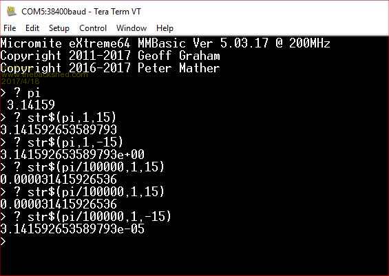I deliberately left the exponent off for an exponent of zero. I am more concerned with the second decimal point - the one at the end of the mantissa. I will try with a few different versions of MMBasic and see which ones it occurs with. Jim VK7JH MMedit |