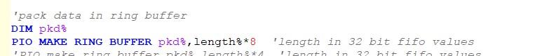 Hi Volhout, thanks for the comment. But since RC12 the ringbuffer did not longer works with my PIO-prog. For a solution I comment the ringbuffer out and go back to the version with dummy-bytes at the end of the array. They are needed to delaying the end of PIO-stop. The ringbuffer is not in use in the workaround. Albert |