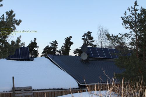 I have Schot Solar Perform 250W solar panels 11 units in my roof. They really perform. When I started this I wanted to have sun-tracking system, but wind conditions here are very rough and 11 units in the roof, mission impossible.(picture) My only option was to mount them on the roof, because the elevation of the terrain. Now they are all at a steep angle, because snow falls from them very easily and late in the autumn and early in the spring, the best angle is deep.. Short time sunlight and sun is shining from very low angle. WE had winter solstice at 22.12-13 and now day is getting longer and sun is getting higher and higher day after day. Now we have temperature -26C that is -14,8 Fahrenheit. There is now snow in my roof (picture is not from this winter) which acts as little mirrors and I get a lot of scattered radiation and also from surrounding terrain which is covered with snow. The atmosphere is also particularly dry and clean, when there is so cold. The amount of light is at maximum and very bright. No wonder there is so called snow blindness among helicopter pilots and hikers in snowy terrain with full sunshine. I have got record high readings from my solar panels. Also panels give their max power readings(and more with with snow blindnes..) without any heat loss, when weather is so cold. Even when the sun is shining just a short time 4-5 hours a day now, I can get my batteries charged. In the summertime I get 85-90 Amps from my panels, now I get 105-135amps, with 24V system. I have got 10-25Kwh daily now, when there is so cold and high pressure, with full sunlight with just few hours. You are so lucky ones