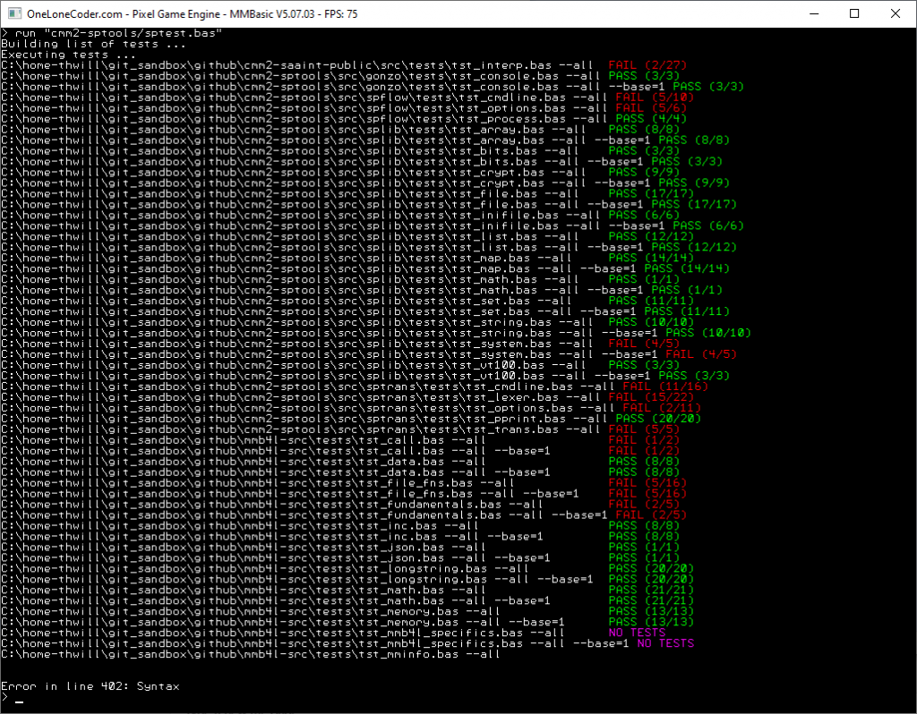 Starting to look pretty good with b4: ![]() Notes: 1. I'm currently focusing on getting them all to run without crapping out ... which is what tst_mminfo is currently doing due to no OPTION SEARCH PATH being implemented. 2. Some of the FAILures are almost certainly false positives. 3. This is NOT a comprehensive set of unit-tests. Two for today before I do some "real work": 1. Is OPTION SEARCH PATH not supported in MMB4W ? Will it be ? 2. Try this: > files "a\b\c" Not found: C:\home-thwill\git_sandbox\github\a\b\\c Note the double \\ before c. Best wishes, Tom Edited 2022-03-08 20:18 by thwill MMBasic for Linux, Game*Mite, CMM2 Welcome Tape, Creaky old text adventures |