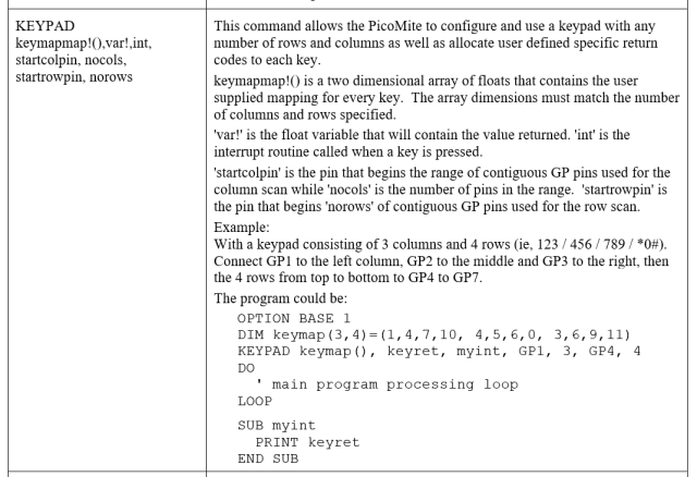 Jan, I'm not sure what to do with commands that are documented in separate PDFs. Some times they are repeated in the main manual, sometimes not. This should be consistent and I will have a look at it. I agree, the KEYPAD command is a mess. Below is my attempt to rewrite it and fix the example program but it needs checking. Peter? Geoff ![]() Edited 2025-12-21 10:53 by Geoffg Geoff Graham - http://geoffg.net |