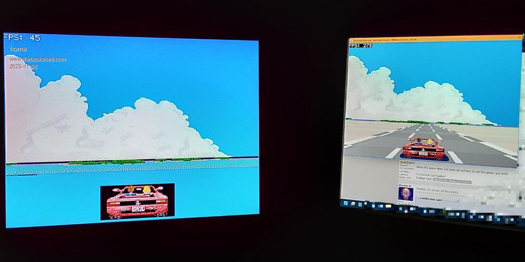 Hello everyone I'm trying to port to the CMM2 the great arcade game Outrun. It will be a challenge to make it run with good performance, this means, I will have a lot of fun I can't promise that the port will be similar to the arcade version. I will try my best to keep it closest as possible to the original. The following screenshot is the result of 300 lines of basic code from this weekend. The source code is not available in my git hub yet. I need to progress a little more before pushing it to its git repo. ![]() Edited 2025-11-17 16:19 by LeoNicolas |
