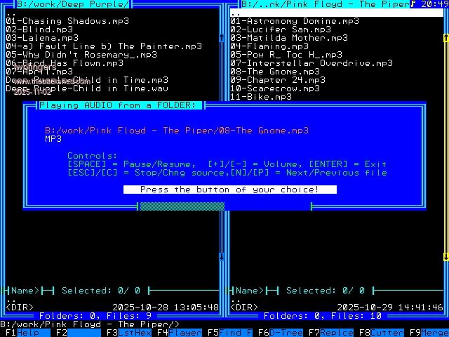 This is the "party edition" of the FM (FM02100b3-Party), an improvement on the FMb2 above. The reason is to test and learn about the possibilities and limitations of the PLAY MP3 (FLAC, WAV) command for RP2350 on drive B:. FM02100b3.Party.zip New is the (experimental) integrated player for mp3, flac, and wav files (with Alt-F4). Both individual files – as before – and entire directories can be played in the background. This means that most of the FM's functions can be used in parallel as usual, except for example, copy operations, for which the audio output is paused. It was also necessary to temporarily disable the blinking cursor in the input routine during audio playback. If an entire directory is to be played, the player assumes that all files are of the same type (mp3, flac, or wav). The player then automatically selects a type. The respective status (off, pause, play) of the player is displayed to the left of the time. The volume is 50 percent by default and can be changed in the player. Caution: In very rare cases, the PicoMite has frozen when playing MP3s in the background and required a reset. ![]() And a big thank you for the great support here. Regards Michael Edited 2025-11-02 01:43 by twofingers |