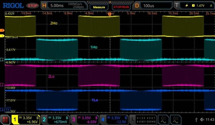 FYI Below: The Controller SPWM HI-LO output switching on J5, referenced to common (GND)A test plug with flying leads is simple to make to plug into J5, solder short leads to pins 1 to 4, these connect to the DSO probe/s, in my case the 4 channels of the DSO are connected to these pins.