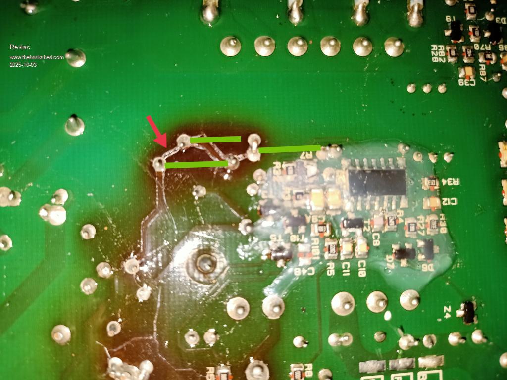 A friend dropped in and asked if I could have a look at his neighbours battery charger, it was working and it just stopped....yes, $ for every time I heard that. Ok this one is CTEK MXS 15, just look at the photo.  Didn't bother plugging it in, just checked power plug with a meter and it was open circuit, so possible internal fuse blown. Looks nice inside and yes internal fuse is blown, dam hard to get to and still don't know its value yet, the question is why did it blow the fuse?  Looking closer, there is some brown on the PCB and those resistors have been a bit warm and the conformal coating has blistered.  On the other side of the PCB, yes something has taken s dump.  I have highlighted with green the placement of 3 resistors seen on the top, the other track (red arrow) is not really a track from what I can tell, its a burn across the PCB shorting between the 2 resistors, haven't seen a schematic to totally confirm this but its a deep groove and likely what eventually blew the fuse, the diode and mosfet check ok there may be other damaged components.