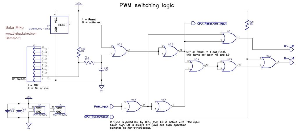 Thought I might have a go at making a MPPT Synchronous PV Charger using "E"-Opto mosfet drivers connected in an inter-lock arrangement. This allows the driver chips be mounted some distance apart and as close to the mosfets as possible. The interlock circuitry also sets the dead time between the H0-L0 devices, along with inputs for disabling the pwm if the cpu voltage rail drops for any reason and falling over to non-synchronous mode with low charge currents at very low duty cycles that would otherwise cause the buck circuit act as a boost driver, which tends to blow thing up. Usually I use dedicated 1/2 Bridge driver chips, these are not always optimal when driving multiple mosfets due to the long trace lengths required, so I thought this circuit would be interesting to play with. I will draw out the schematic, as some of it is a bit complicated, post bits of it here as I do so. The pcb is 204 x 170 mm 1oz copper, all high current areas are masked for tinning, this adds to the copper thickness and allows judicious soldering of extra copper wires to increase the current capacity, not sure what power this board will handle, should be ok at 40 amps, I now have a hand held thermal camera, so will be easy to pick out hot spots. Here is the current layout: Just noticed the bottom layer text is reversed, will fix that, a tick box has unchecked itself. Cheers Mike |