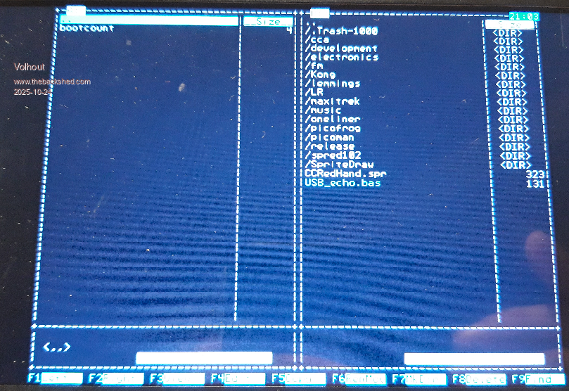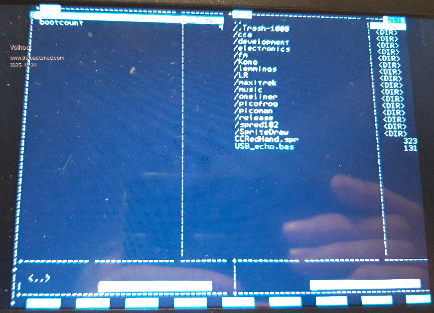 @Peter, The filemanager miniFM uses current font information, and reserved variables as MM.HRES to determine the screen format. Below is tested on RP2040 VGA PS2, and in both cases there was no console connection (that could have impact at screen settings). Attached are 2 screenshots of b20, and RC6, starting from a virgin system, where all OPTION's where set identical, and no prior program where run (that could impact font or resolution). b20 (correct screen buildup) ![]() RC6 (screen is misaligned, width is incorrect, height is incorrect). ![]() I have tried this with several versions of the filemanager. Versions that all operate correct with b20. Volhout |
