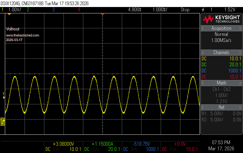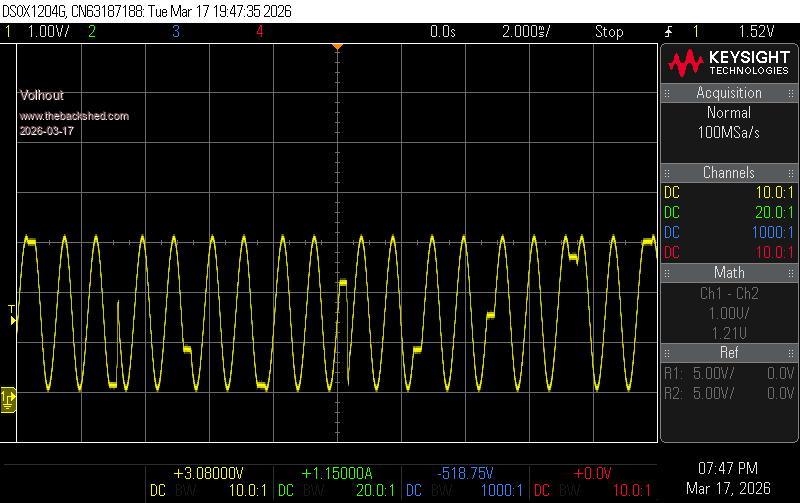 Peter, Could you please undo the changes in RC4/RC6, where calculations where taken out of the HW interrupt. The earlier versions had a nice soft transition to the next sinewave. rc6 does not have that anymore. This is a varying frequency tone on rc2, using Frank 's program. Nice sine waves with smooth varying tones. Do Play volume 100,100 For z=1 To 4 For n=980 To 1020 Play tone n,n Pause 2 Next For n=1020 To 980 Step -1 Play tone n,n Pause 2 Next Next z Play volume 0,0 'Play stop Pause 200 Loop RC2 ![]() This is the signal of the same program running rc6 (the improved version you fixed for frogger). RC6 ![]() The change is definitely a step back. Please undo this change. Volhout Edited 2026-03-17 22:38 by Volhout |