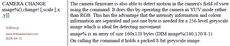 @Peter, I applaud a PICOMIN2040. Turtle and Ray are more for HDMI/VGA. Structures ... you know my opinion, they divert too much from core basic. GUI controls : these might be useful in embedded applications SSD1963 eats up all IO (even in 8 bit mode) so the RP2040 cannot be used much anymore If you appreciate I will take some time to find more victims. On CAMERA Appart from mentioning 252MHZ clock speed, there is also a bug in the manual. ![]() The image%() array must be 1 dimensional. DIM image%(160*120/8-1) Volhout P.S. in this version, camera is not closed when doing a new RUN. Or stopped when the program ends. . Edited 2026-04-10 21:42 by Volhout |