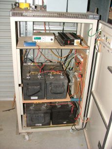There are 3 solar panels, two near new 80 watt and one very sad 70 watt panel that's making about 20 watts. So all up I have about 180 watts of solar feeding into my PicAxe windmill charge controller set up as a solar regulator for now, its does the trick. For batteries I'm using 2 near new 100AH deep cycle batteries, and 4 2nd hand truck batteries ( 2 at 1400CCA and 2 at 1500CCA, not sure on the AH rating of these but it should be good, they weight a ton! ). All batteries are connected in parallel, along with a Megapulse. The 80 watt panels, 100AH batteries and Megapulse came from Trev ( Foundry and Fibreglass ). The batteries ( except for two on top ), controller and inverted are housed in an old robot control cabinet.