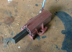 | Next we need to make our brush holder. I used a length of 20mm square hardwood, and cut two recesses to keep the strapping square. The two holes are for the mounting bolts. |